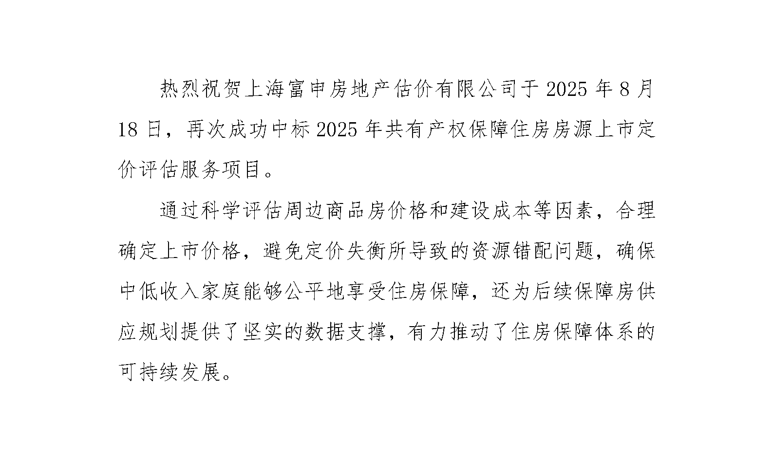 上海富申房地产估价有限公司再次成功中标2025年共有产权保障住房房源上市定价评估服务项目